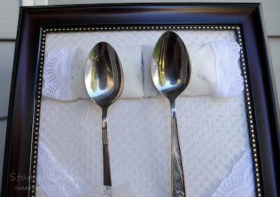 I cut a piece of cardboard the size to fit in the frame and then decorated it with fancy white paper, ribbon, the spoons and a stamped piece of vellum.