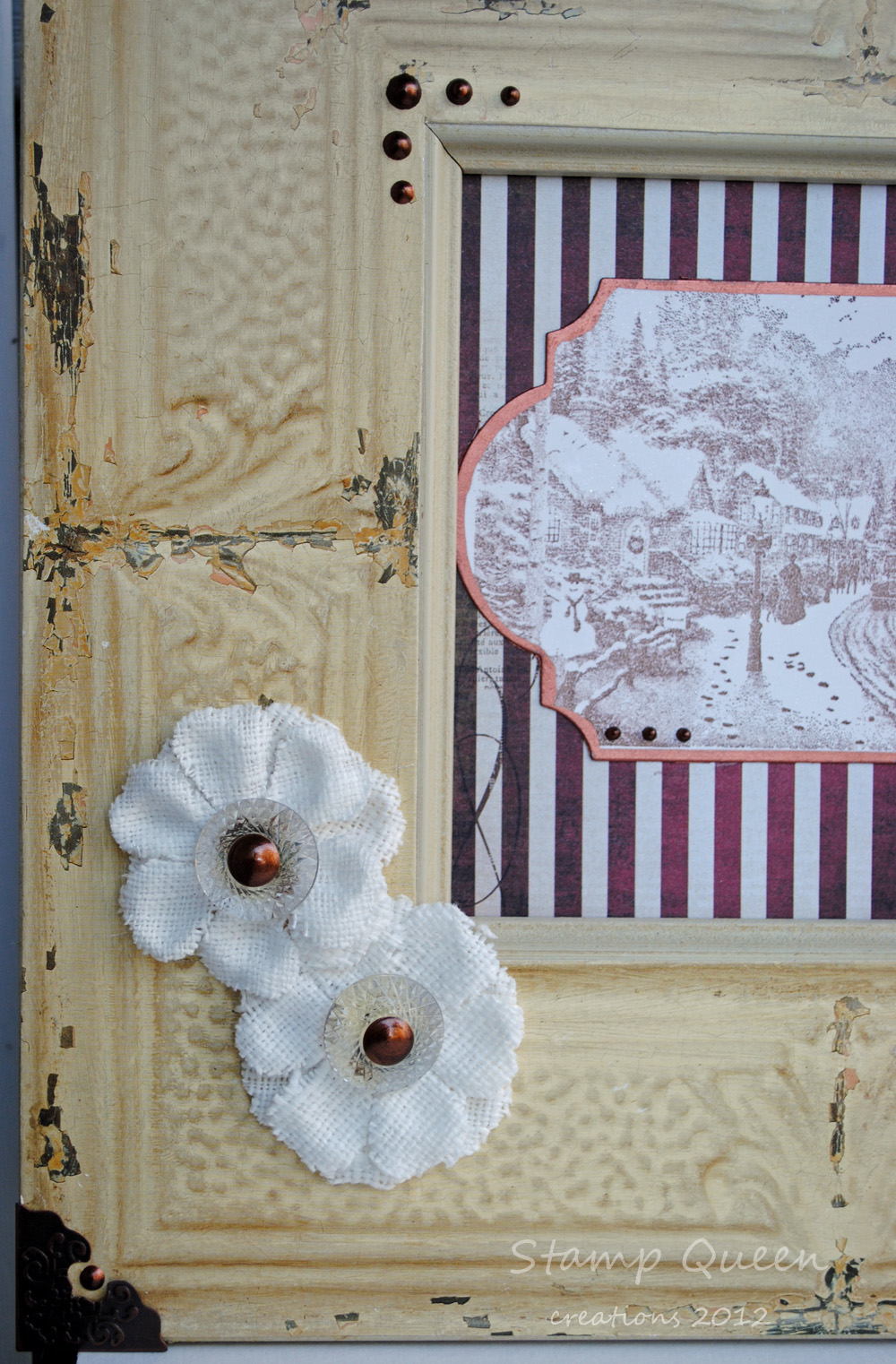 Just popping in a bit to show you another project made with the Thomas Kinkade stamp from Cornish Heritage Farms and the last of the cool tin tile look picture frames that I found at a thrift store (maybe I will get lucky and find some more sometime)